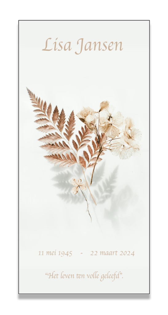 Het grafmonument biedt een liefdevolle en tijdelijke herinnering, totdat het blijvende monument wordt geplaatst dan halen we het frame op en sturen we het doek na.
